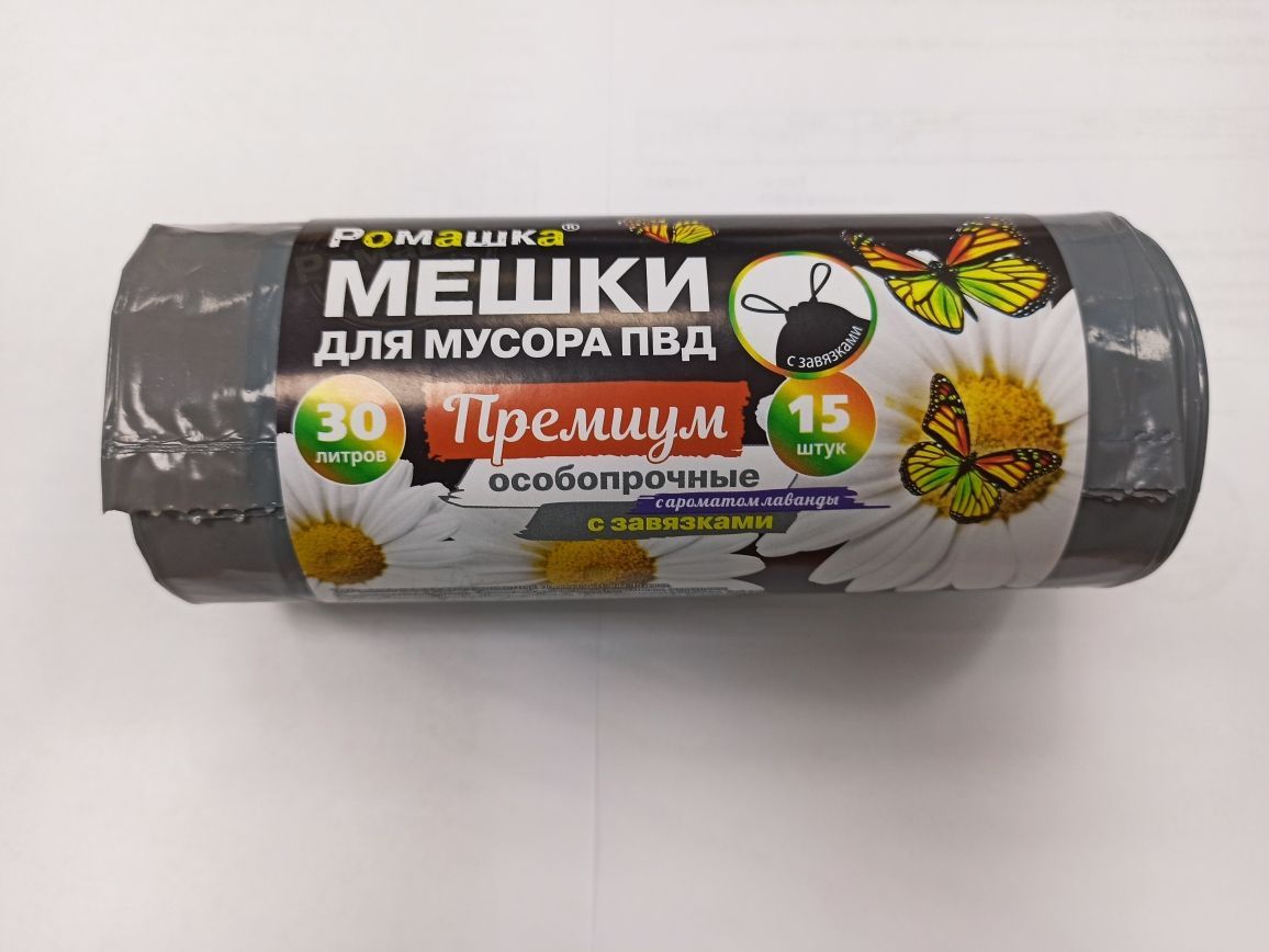 Мешок для мусора 30л рулон ПВД (50х58)-35 с завязками серые (лаванда) ПРЕМИУМ Ромашка (15шт) 1/12 – купить хозяйственные товары в розницу с доставкой