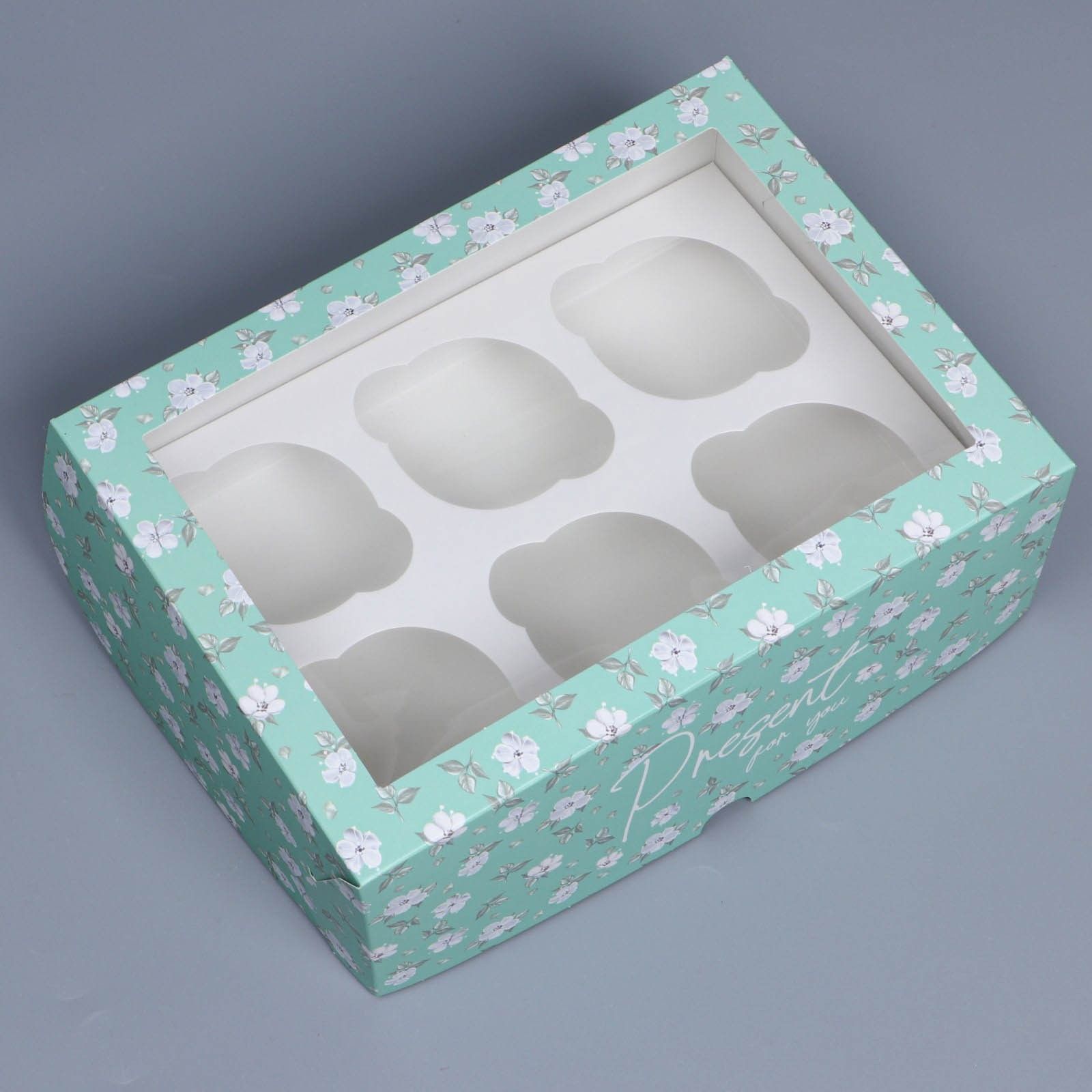 Коробка для капкейков/маффинов с окном 250х170х100мм на 6шт картон Зелёный паттерн 1/5 купить оптом и розницу с доставкой в Казани