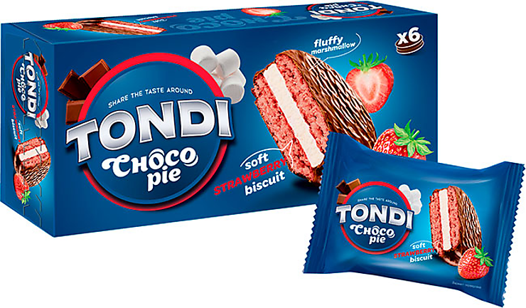 —Продукты, Печенье Tondi choco Pie печенье-сэндвич клубничный 180 г 6шт 1/16