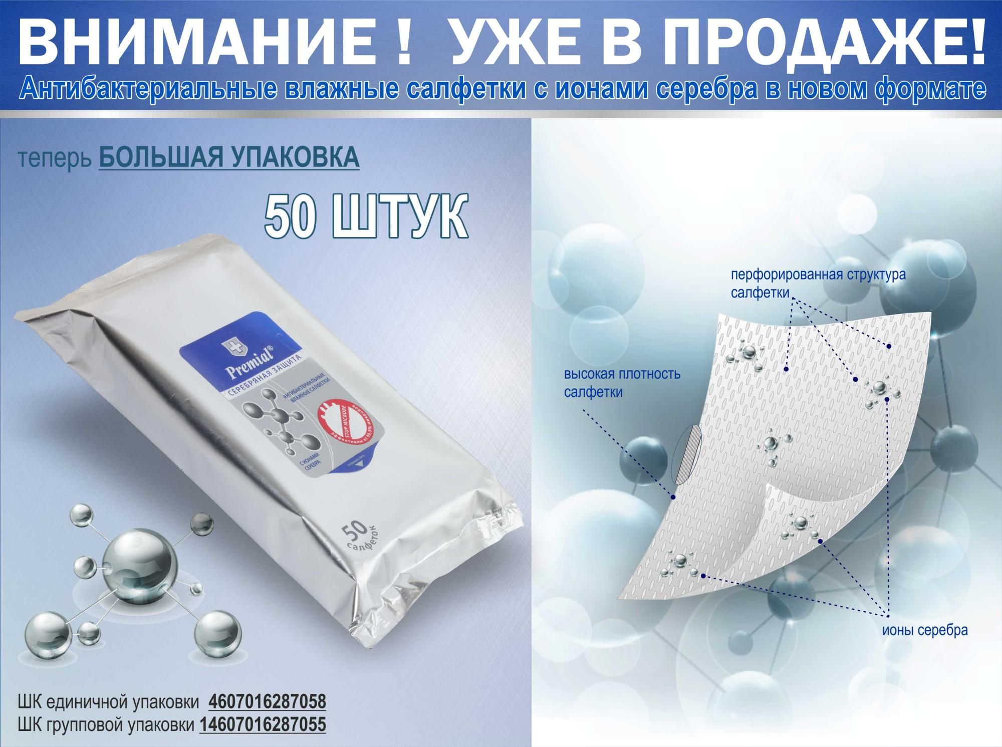 Салфетки влажные Premial Антибактериальные Серебряная защита (50) 1/10 купить от производителя в Казани
