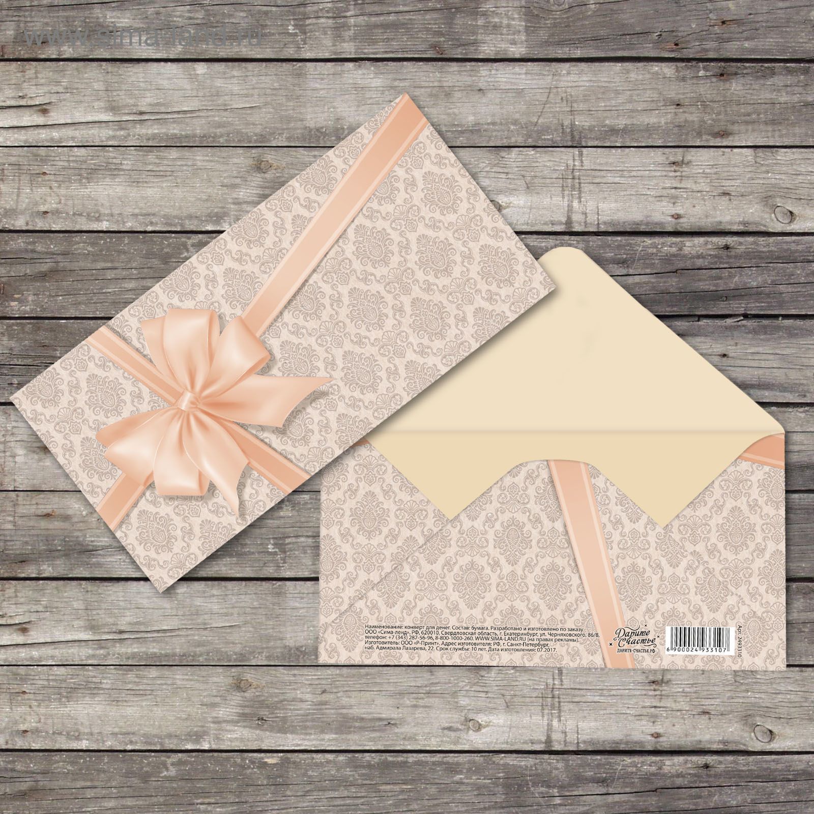 Конверт для денег 16,5х8см Подарок Персиковый бант 10/10 оптом и в розницу в Казани, цены в каталоге с доставкой