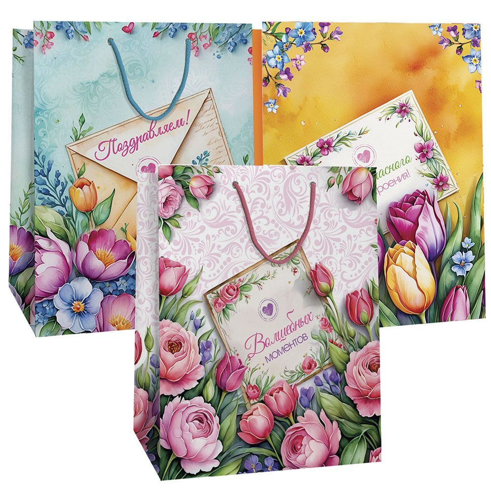 Пакет подарочный бумажный (18х23х10) ламинир Микс 3 дизайна 1/12/360 оптом и в розницу в Казани, цены в каталоге с доставкой